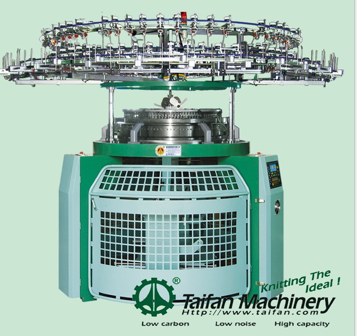 本机具有四针道具备可织3:1.2:1斜纹及平纹等组织变化多,用途广,广泛用于 运动系列服装,卫生衣,睡衣裤,婴儿衣等御寒性衣物。本机可织长短纤维布面清爽、 毛圈牢固,长度一致,加装氨纶配件可织高弹性LYCRA布 型号 筒径 针数 口数 TF-SML2 26"-34" 14G-28G 52F-102F
